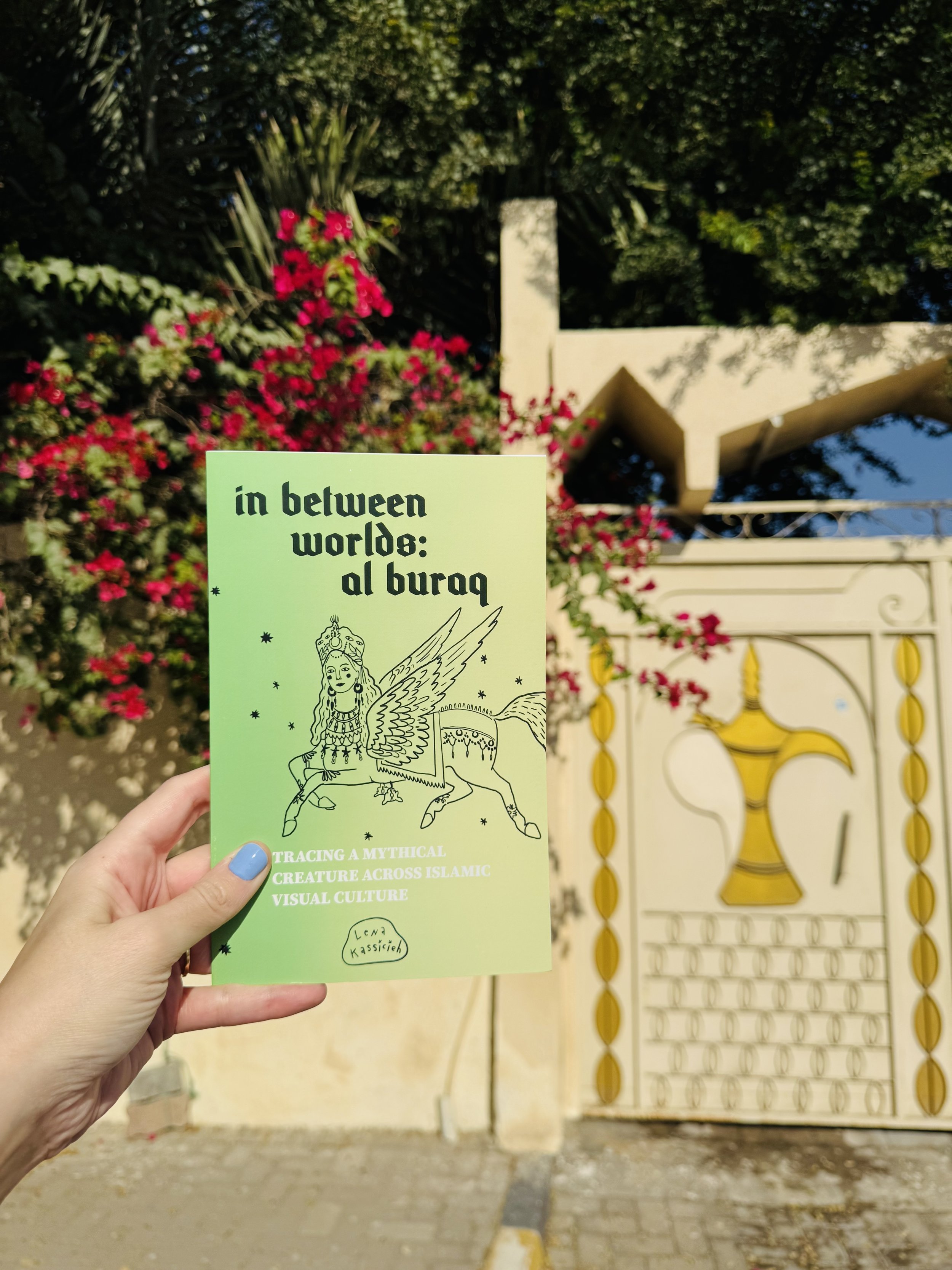 The first iteration of this research culminated in In Between Worlds: Al-Buraq, a small-format artist's book created for the Focal Point Book Fair at Sharjah Art Foundation (December 2025). Combining visual analysis with personal reflection, the book examines Al-Buraq's transformation from vehicle of transcendence to contemporary symbol of Palestinian resistance, exploring how spiritual ascension carries the weight of displacement.